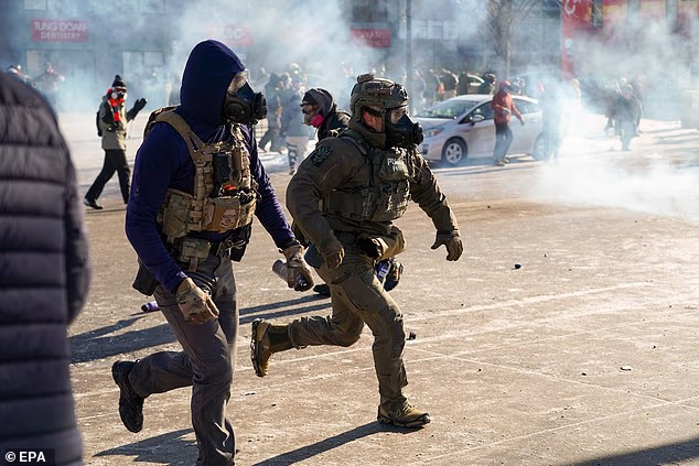 Um agente federal dispara uma bomba de gás lacrimogêneo contra os manifestantes enquanto os agentes se movem através de uma nuvem de gás lacrimogêneo durante os confrontos depois que um manifestante foi morto a tiros no início do dia 24 de janeiro de 2026 em Minneapolis, Minnesota.