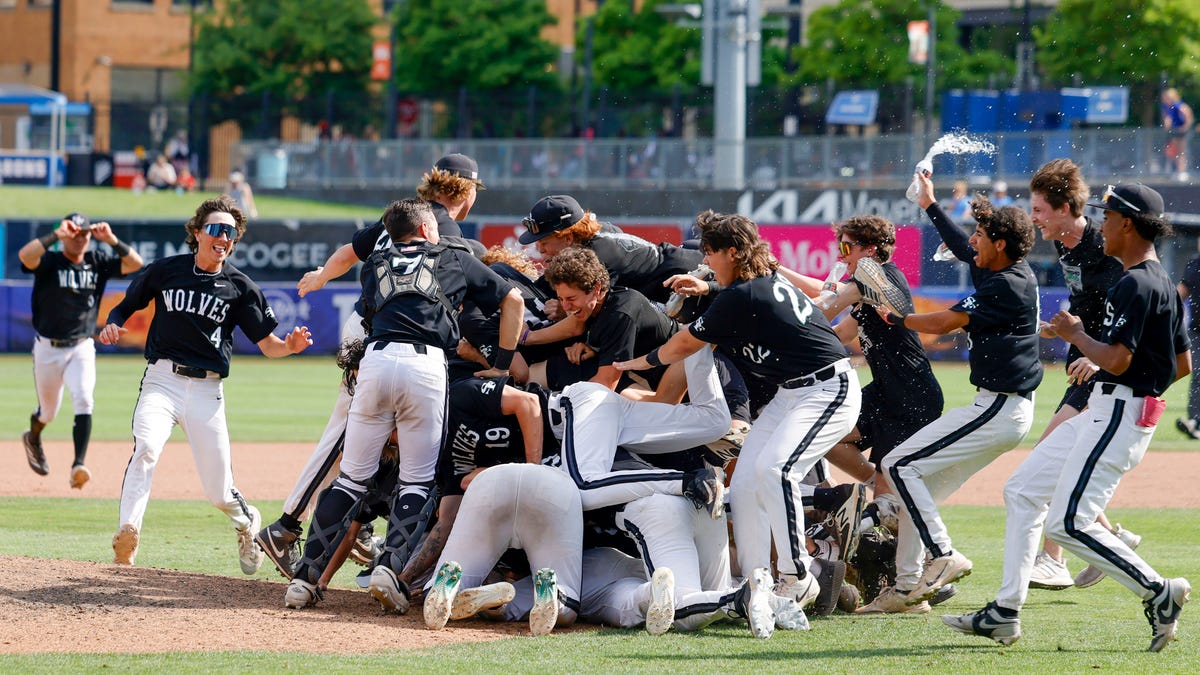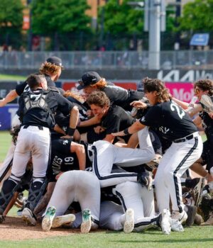 O treinador de beisebol de Edmund Santa Feth, Chris, compara o jogo de campeonato de sua equipe contra o Web Ovasso, comparando as costas e os prêmios.