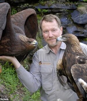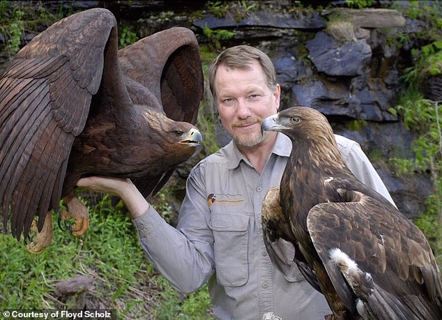 A escultura russa Berkut Golden Eagle em tamanho real de Scholz foi criada ao longo de cinco meses. A águia e a base da rocha foram esculpidas inteiramente em madeira de tupelo e têm mais de um metro de altura