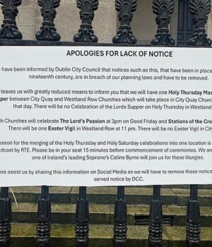 Mas uma placa afixada esta semana notificando os paroquianos sobre os horários das missas de Páscoa – incluindo uma apresentação especial da famosa soprano Celine Byrne – também dizia que tais avisos eram considerados uma violação da lei de planeamento, de acordo com uma comunicação recente do Conselho Municipal de Dublin (DCC).
