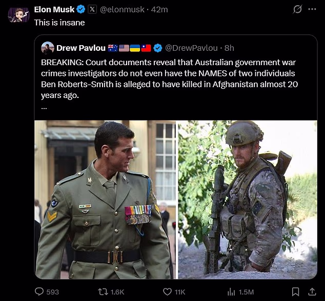Elon Musk opinou novamente sobre a prisão de Ben Roberts-Smith após uma longa investigação