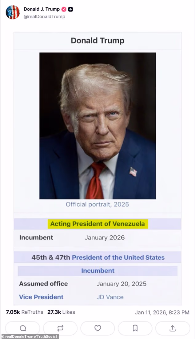 No fim de semana, o Presidente dos EUA publicou uma imagem adulterada de uma página da Wikipédia no Truth Social mostrando que ele é o “Presidente em exercício da Venezuela”.