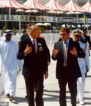 Andrew Mountbatten-Windsor com Sir Charles Masefield em 2001. Patrick Nixon, o então embaixador nos Emirados Árabes Unidos, disse sobre a visita do Duque de York à região em Novembro de 2001: ‘Fiquei particularmente preocupado com alguns dos comentários desumanos e ofensivos sobre a Arábia Saudita e o seu petróleo’.