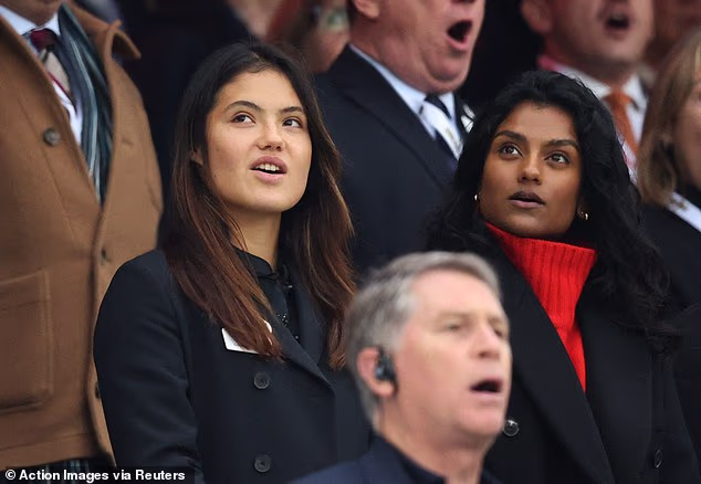 A esportiva Emma exibia um visual natural com maquiagem mínima, um casaco elegante e suas longas tranças castanhas fluindo livremente enquanto ela apoiava com entusiasmo o time inglês.