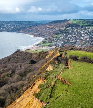 Uma vista aérea do deslizamento de terra em curso em Stoneborough Hill em Charmouth, Dorset, que bloqueou o caminho da costa sudoeste