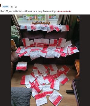 Ontem (segunda -feira), havia uma visão equivocada nas aldeias da torre quando um pequeno grupo de limpadores do conselho começou a cortar as bandeiras da Inglaterra dos postes de luz.