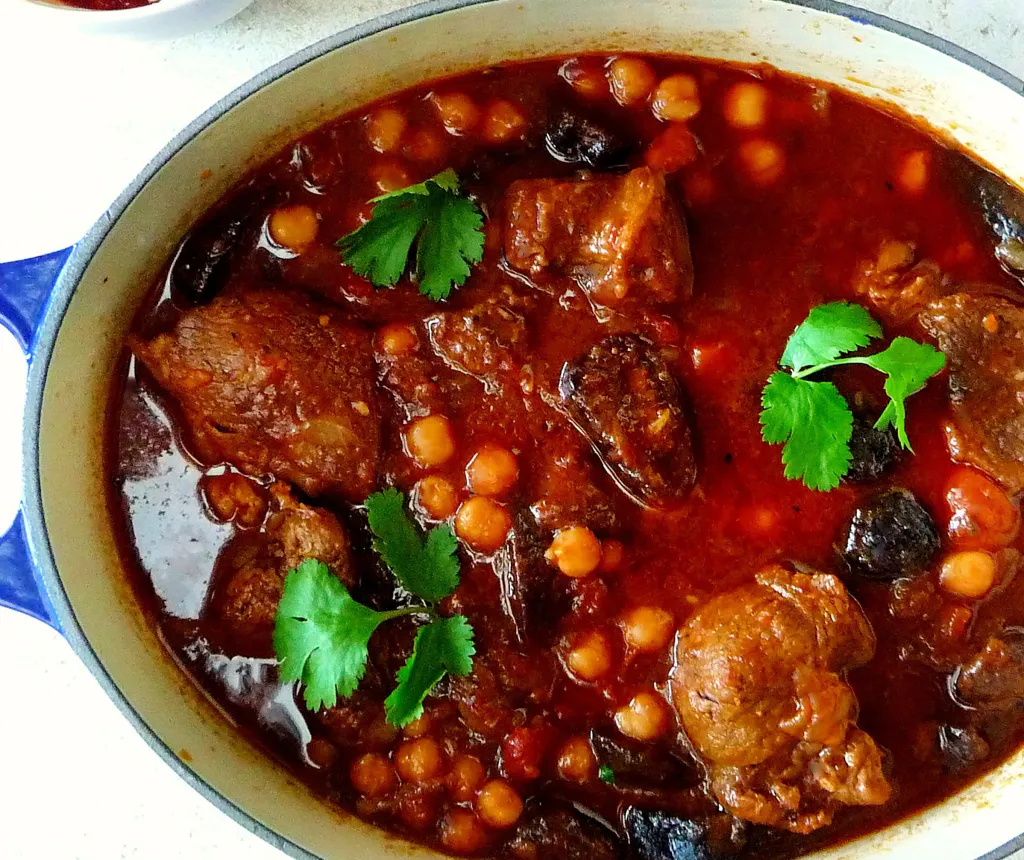 Este guisado perfumado e carnudo irá transportá-lo para Marrocos. É adoçado com figos, inebriante com harissa e perfumado com ras el hanout – uma mistura de especiarias do norte da África que inclui especiarias secas dignas de uma loja.
