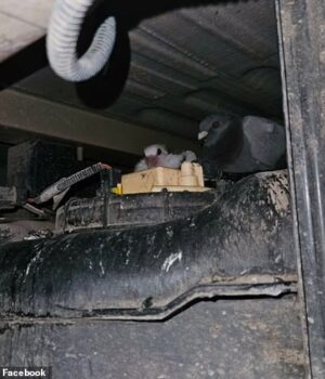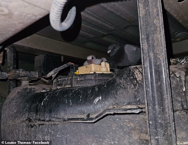 Uma família de pombos foi vista escondida em um espaço estreito sob uma van de entrega do Royal Mail – depois de passar três semanas secretamente com o motorista.