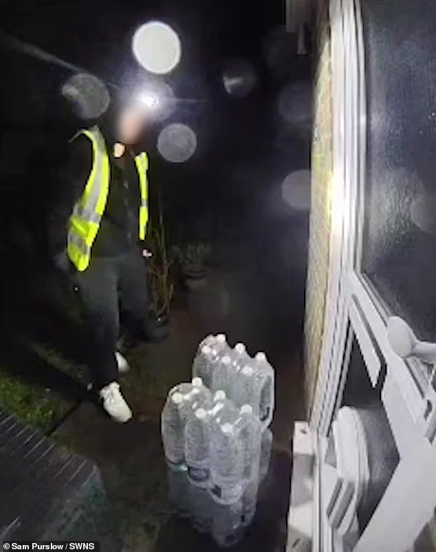 O homem é visto distribuindo quatro caixas de água engarrafada e tirando uma foto – antes de tirar novamente e sair momentos depois