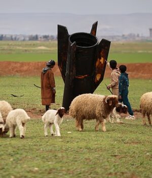 Na quarta-feira, uma munição não detonada foi encontrada Num campo aberto em Qamishi, nos arredores do leste da Síria, há a alegria de pastar ovelhas.
