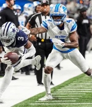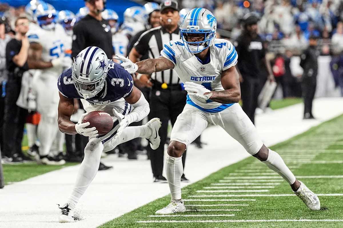 No Dallas Cowboys, o wide receiver George Pickens (3) teve seu pior jogo estatístico desde a abertura da temporada, com apenas cinco recepções para 37 jardas na derrota por 44-30 para o Detroit Lions. Ele também cobrou dois pênaltis e rebateu um passe para interceptação.