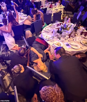 Acredita-se que Cole Thomas Allen, 31 anos, tenha alvejado membros da administração Trump quando foi acusado no salão de baile no Jantar de Correspondentes da Casa Branca, na noite de sábado. Ele é fotografado após ser derrubado no chão e preso