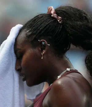 Alicia Parks, dos Estados Unidos, enxuga o suor do rosto durante sua partida da segunda rodada contra Karolina Muchova, da República Tcheca, no campeonato de tênis do Aberto da Austrália, quarta-feira, 21 de janeiro de 2026, em Melbourne, Austrália. (Foto AP/Asanka Brendan Ratnaike)