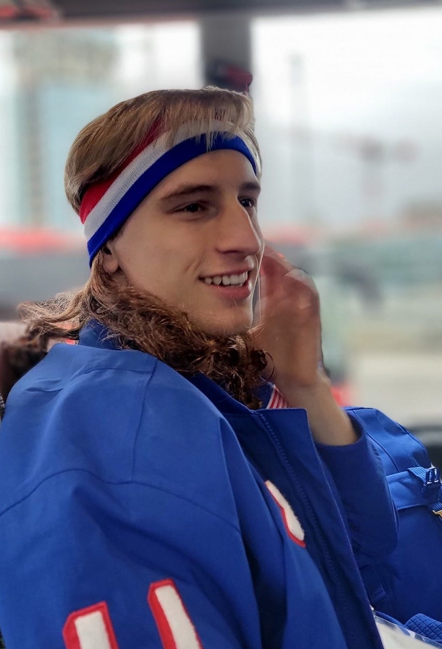 A patinadora de velocidade com medalha de ouro olímpica Jordan Stolz usa uma peruca no ônibus a caminho do Estádio de Patinação de Velocidade de Milão em 14 de fevereiro.