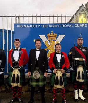 Jimmy Fallon com 5 soldados escoceses durante uma viagem às Terras Altas da Escócia