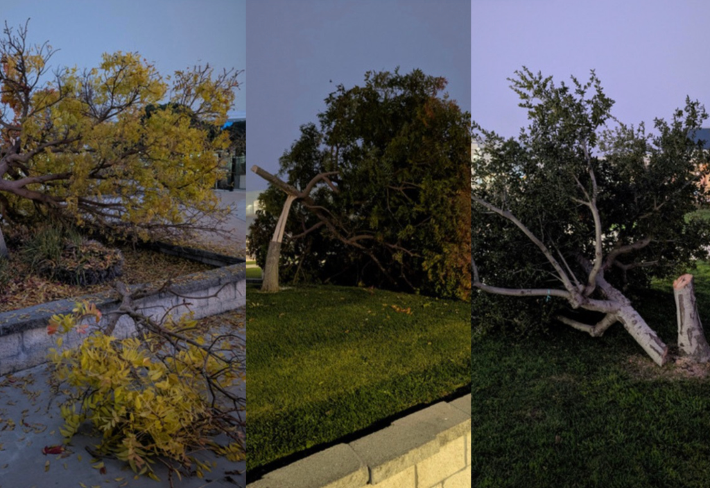 De acordo com autoridades e funcionários distritais, as árvores cortadas incluíam um carvalho vivo, um bordo vermelho, um medronheiro, um sicômoro, uma murta crepe e três árvores de pistache chinesas. Vândalos mascarados apareceram no campus durante a noite, usando uma ferramenta elétrica para derrubá-los.