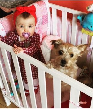 Baby Matilda com a maravilhosa cadela Bonnie em seu berço