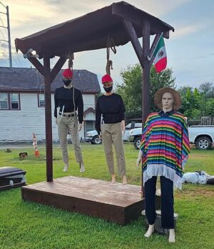 Então Rodriguez provavelmente criou sua exibição mais entusiasta no mês passado: Manquins alguns alegaram que uma bandeira mexicana estava voando em cima de uma forca como agentes de imigração.