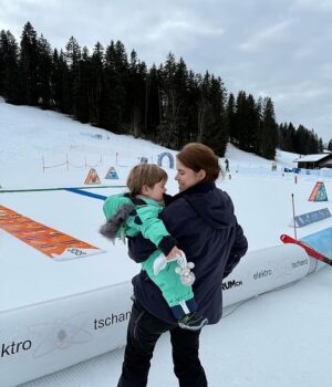 Eugenie, fotografada em férias de esqui anteriores com o filho Ernest, foi vista nos Alpes suíços quando seu pai foi preso