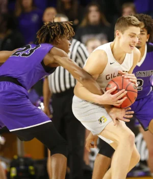 Carson Tout (33) de Gilbert sofre falta de Darron Holmes (23) do Millennium durante o jogo do campeonato estadual 5A masculino em 25 de fevereiro de 2019, em Tempe, Arizona.