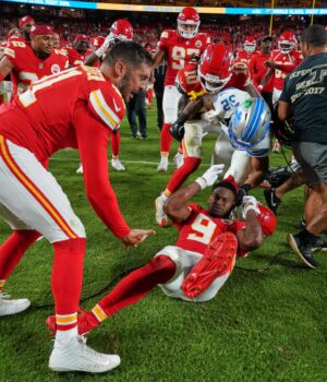 Após a joelhada final, o ramo do Safety Bran de Patrick Mahomes Lions tremeu, que rejeitou o convite do quarterback. Então o pôquer Smith-Scaster expandiu sua própria mão e disse algo no galho. Smith-Scaster empurrou-o para a grama diante da proteção.