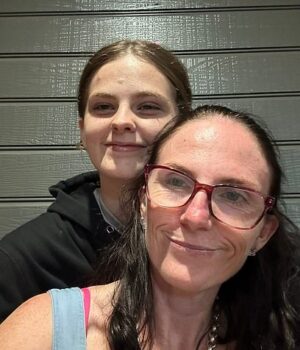 Bishop (esquerda) e mãe Kylie Johnson (à direita) em Fiobe. FioBo está faltando mais de uma semana