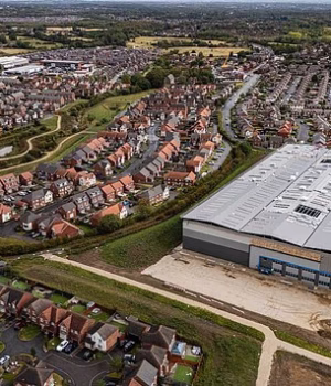Os quatro armazéns cinza escuro – que têm até 60 pés de altura – fazem parte do Astley Business Park em Tyldesley, Wigan e foram assinados pela autoridade local em junho de 2024.