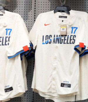 A nova camisa apresenta “Los Angeles” em letras Dodger azuis e brancas. A escrita usada para as letras “Los Angeles” é comumente usada para “Dodgers” em uniformes convencionais de casa e fora de casa.