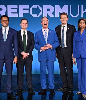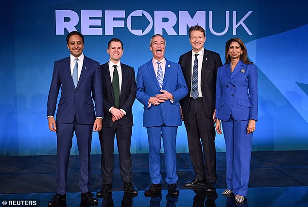 Nigel Farage revelou pela primeira vez o núcleo de um ‘Gabinete Sombra’ de reforma, com o ex-ministro conservador Robert Jenrick desempenhando um papel fundamental. Foto: Zia Youssef, Genrique, Richard Tice, Faraj e Suella Braverman