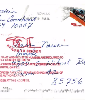 Acredita-se que a carta de Epstein para Larry Nassar, carimbada em 13 de agosto de 2019, tenha sido devolvida ao remetente na sala de correspondência de uma prisão de Nova York após sua morte. O FBI alegou que o cartão postal era falso