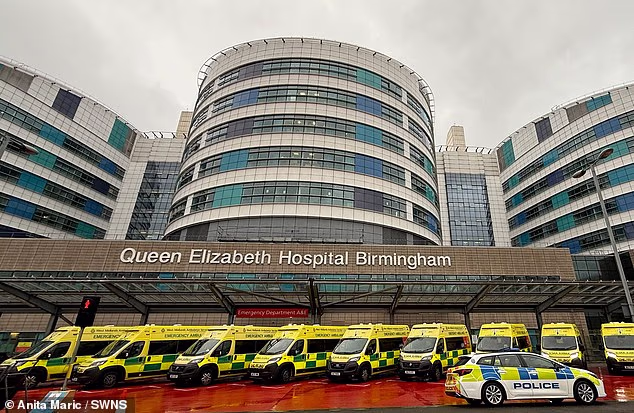 Uma fila de ambulâncias estacionadas em frente ao Hospital Queen Elizabeth, em Birmingham, no início deste mês