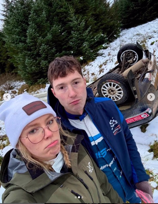 Holly McRae, 26, estava ao volante do Mini Challenge no RAC Rally em Kildare Forest, Northumberland, quando o carro derrapou para fora da estrada, caiu em uma vala coberta de neve e rolou até o teto.