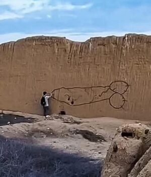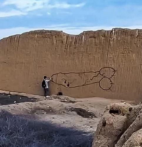 Ele usava uma mochila e pintou um enorme pênis preto nas rochas com mais de 600 anos e um local do patrimônio mundial.