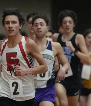 Mark Desforges, da Fox Lane, lidera a corrida masculina de 1.600 metros no Saffron Invitational em 16 de janeiro de 2026 no Rockland Community College. O sênior venceu em seu melhor momento pessoal.