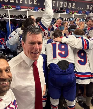 O diretor do FBI, Kash Patel, é fotografado dentro do vestiário com estrelas do hóquei do time dos EUA