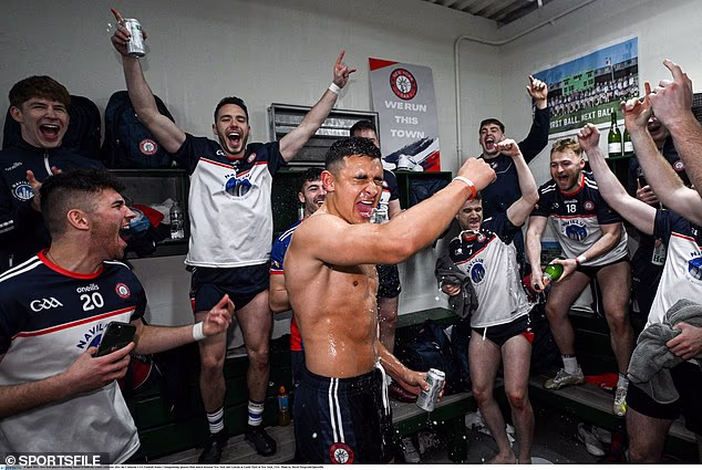Jogadores de Nova York, incluindo Daniel O’Sullivan, comemoram após as quartas de final do Connacht GAA Football Senior Championship entre NY e Leitrim no Gaelic Park, Nova York