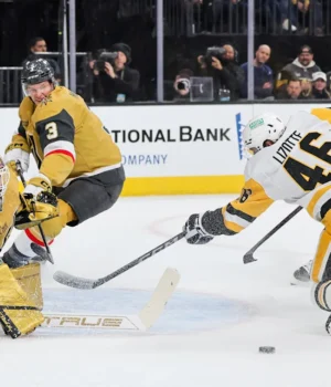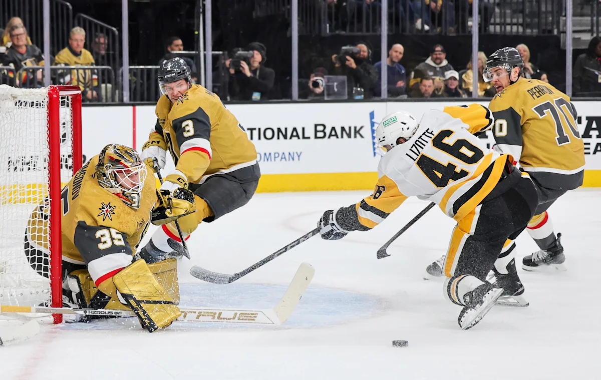 LAS VEGAS, NEVADA – 07 DE MARÇO: Ilya Samsonov nº 35 do Vegas Golden Knights faz uma defesa enquanto Blake Lizotte nº 46 do Pittsburgh Penguins busca um rebote durante o primeiro período de seu jogo na T-Mobile Arena em 07 de março de 2025 em Las Vegas. (Foto de Ethan Miller/Getty Images) | Imagens Getty