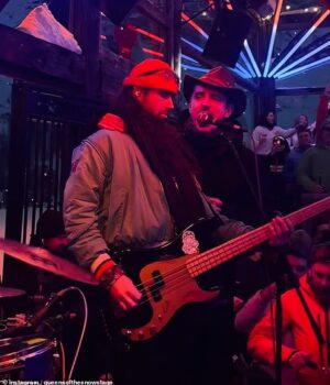 O comentarista da Sky Sports, de 1,1 milhão de anos, usava um chapéu de cowboy enquanto cantava Livin’ on a Prayer, do Bon Jovi, e ‘She’s Electric’, do Oasis, enquanto se apresentava no palco com a banda de rock Queens of the Snow.