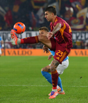 ROMA, ITÁLIA – 30 DE NOVEMBRO: Lorenzo Pellegrini da AS Roma controla a bola sob pressão de Sam Beukema do Napoli durante a partida da Série A entre AS Roma e SSC Napoli no Stadio Olimpico em 30 de novembro de 2025 em Roma, Itália. (Foto de Paolo Bruno/Getty Images)