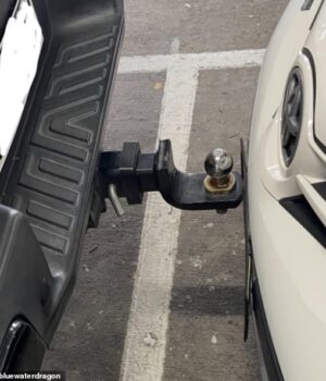 ‘De volta ao assunto. Eles ainda estavam pendurados do outro lado da vaga do carro. Graças a Deus pela minha placa alternativa da barra de proteção”, eles legendaram a foto.