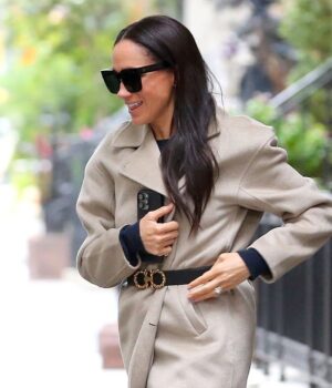 Sussex Meghan Merkel Duquesa apareceu com um casaco bege em um dia chuvoso na cidade de Nova York depois de visitar Gloria Steinem