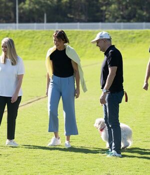 Anthony Albaniz pode fazer uma pegada confortável, porque novas pesquisas mostram que o trabalho está avançando (retratado com Jodi Hydeon, um membro trabalhista do Benelong Jerome Luxal, seu parceiro Joe Taranto e Lane Cov West’s Dog Toto e Toby)