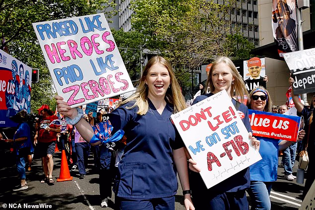Apesar de serem a espinha dorsal do maior sistema de saúde da Austrália, enfermeiras e parteiras estão recebendo aumentos salariais substanciais (na foto, enfermeiras protestam em NSW em 2024).