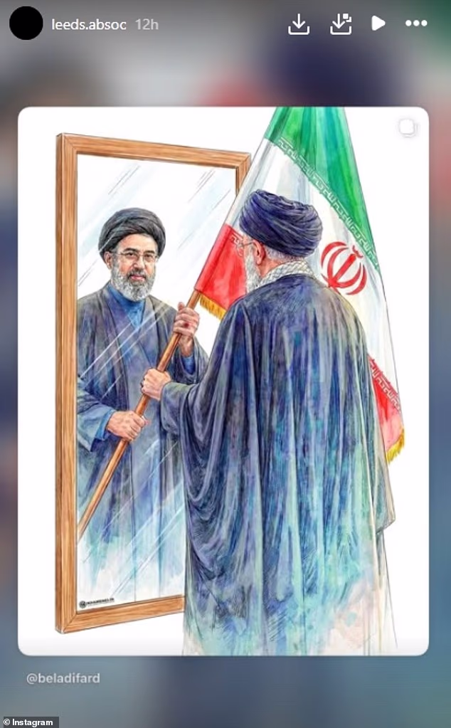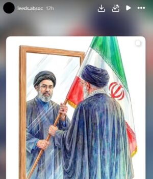 A Sociedade Islâmica Ahlul-Bait de Leeds postou ontem um esboço colorido do falecido aiatolá Ali Khamenei entregando a bandeira iraniana a seu filho Mojtaba em sua história no Instagram com sua imagem exibida em um espelho.