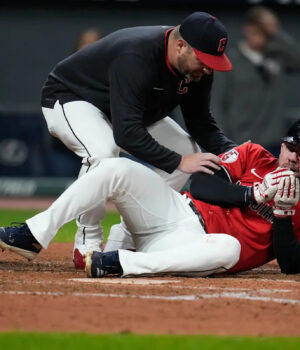 Quando as batatas fritas caíram na caixa de batedores e agarraram seu rosto, o diretor de Cleveland, Stephen Vogue, e os treinadores correram para o campo, um mergulho visível largou a luva e o boné.