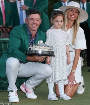 McIllro vestindo sua filha Papi e sua esposa Erica vestindo Mestres Green Jaqueta Dedicada