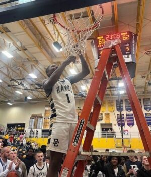 O guarda do Decatur Central, Devin Colbert Jr., corta a rede após a vitória do Hawks pelo título seccional por 69-62 sobre Southport.