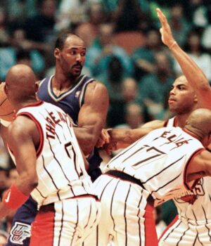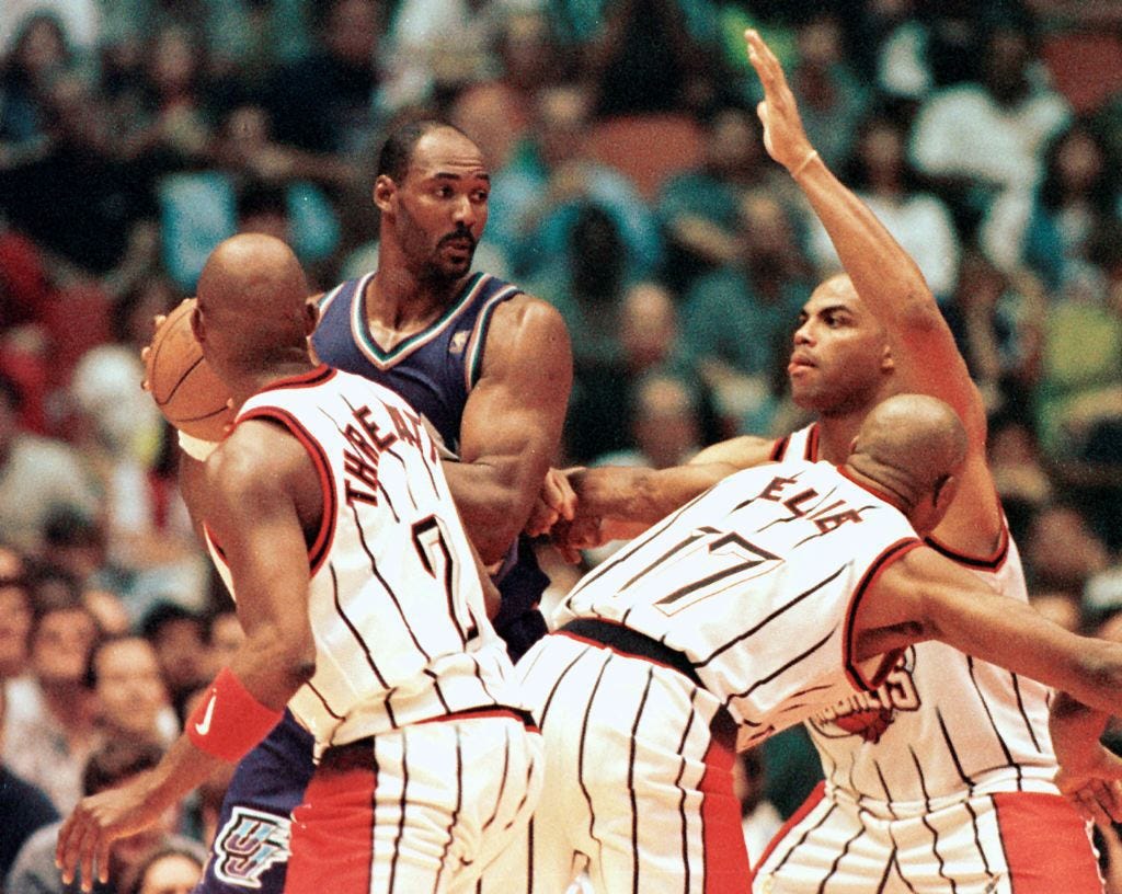 O jogador do Utah Jazz, Karl Malone (R), é cercado pelos defensores do Houston Rockets a partir da esquerda durante o quarto jogo do NBA Western Conference Championship no The Summit em 25 de maio em Houston, TX. O Jazz perdeu para o Rockets por 95-92. Foto AFP/Hector Mata (Foto de Hector Mata/AFP) (o crédito da foto deve ser Hector Mata/AFP via Getty Images)