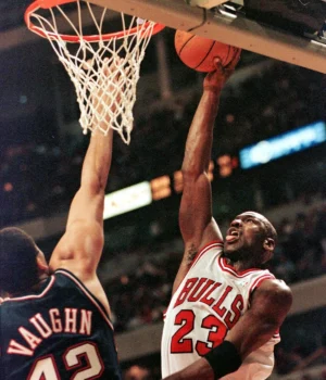 O armador do Chicago Bulls, Michael Jordan (R), vai até a cesta enquanto é coberto pelo atacante do New Jersey Nets David Vaughn durante o primeiro quarto, 16 de março, no United Center em Chicago, Illinois. AFP Photo/Vincent Laforet (Foto de Vincent Laforet/AFP) (o crédito da foto deve ser Vincent Laforet/AFP via Getty Images)
