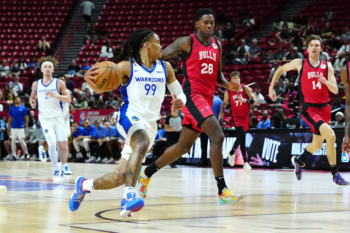 14 de julho de 2024; Las Vegas, Nevada, EUA; O guarda do Golden State Warriors, Yuri Collins (99), dribla o guarda do Chicago Bulls, Chase Audis (18), durante o quarto período no Thomas & Mack Center. Crédito obrigatório: Stephen R. Sylvanie-USA TODAY Sports